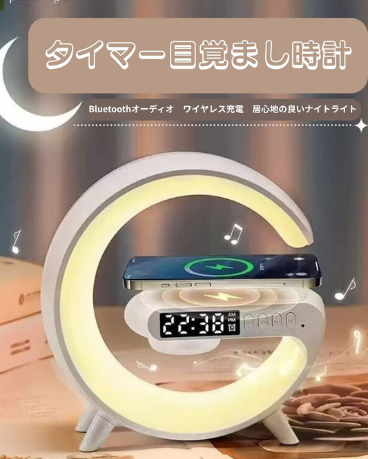 iphone/android対応 QI 充電器 多機能 スピーカー 目覚まし時計 5in1 ライト