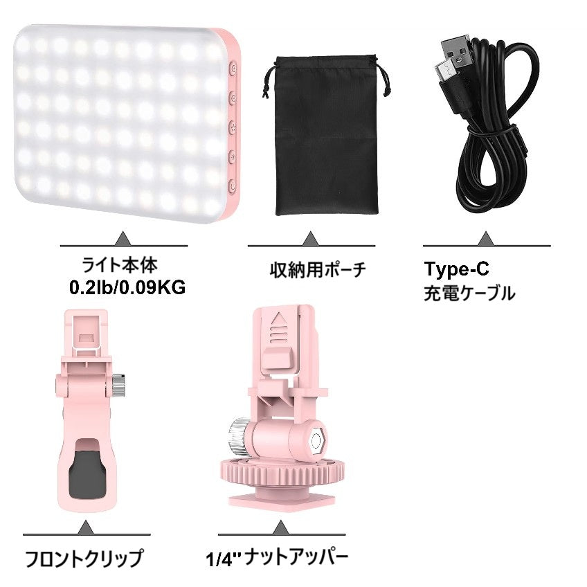 パッケージ内容: LED ビデオライト 1 個、クリップ 1 個、USB-C ケーブル 1 個、1/4 インチ ホットシュー マウント 1 個、収納ポーチ 1 個、ユーザーマニュアル 1 個。